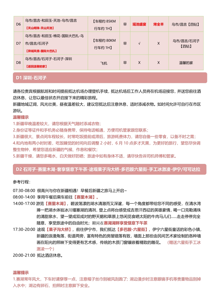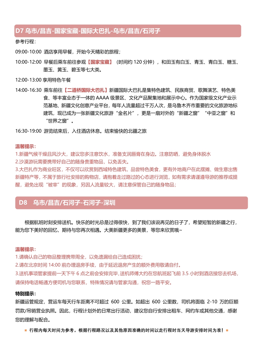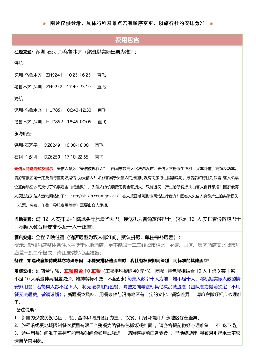 用餐安(ān)排:酒店(diàn)含(hán)早餐,正餐包含10正餐(正餐平均餐標40元/位,團餐+特色餐相結合10人1桌8菜1湯(tāng),不足(zú)10人菜量(liàng)種類相應減少,維持餐標不(bú)變,不含酒水)每桌人數(shù)以十人為準,如(rú)不足十人,將根據實際人數酌情安排用餐;若每桌人數不足6人,將無法享用特色餐,調整為同等餐(cān)標其他菜品或退餐(團隊餐為提前預定,不用餐無法退費,敬(jìng)請諒解);新疆餐飲風味、用餐條件與沿海地區有一(yī)定(dìng)的文化(huà)、餐飲差異 ,請旅客做好相應心理準備。