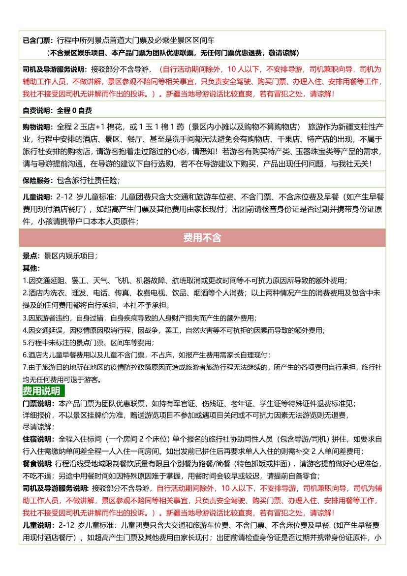 司機及導遊服務說明:接(jiē)駁部分不含導遊,(自行活動期間除(chú)外,10人以下,不安排導遊,司機兼(jiān)職向導,司機(jī)為輔助工作人員,不(bú)做講解,景區參觀不陪同等相關事宜,隻負責安(ān)全駕駛、購買門票、辦(bàn)理入住(zhù)、安排用餐等工(gōng)作,我社不(bú)接受因司機(jī)無講解而作出的投訴。)。新(xīn)疆當(dāng)地(dì)導遊說話比較直爽,若有冒(mào)犯之處,請諒解!