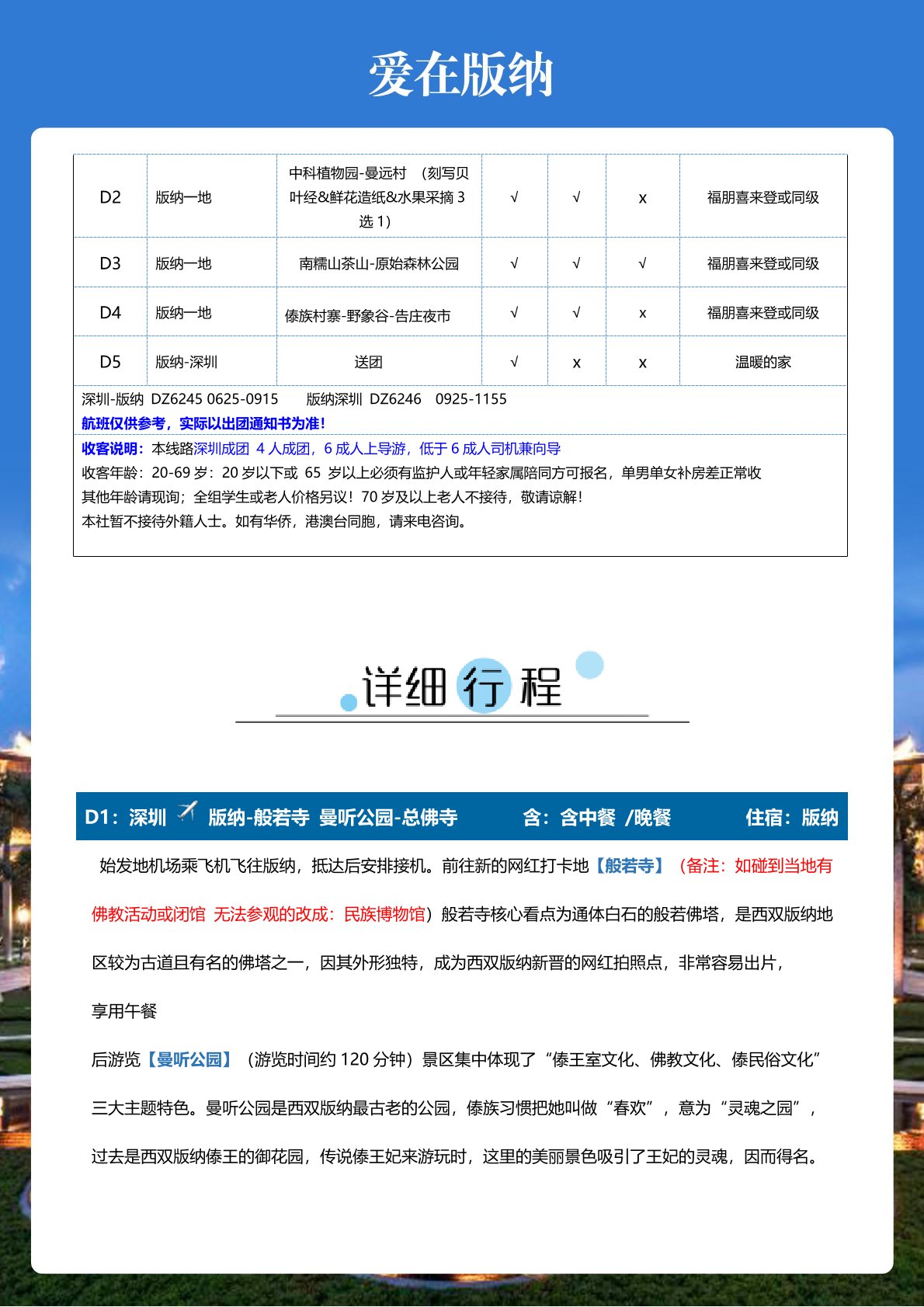 4、用 餐:含4早6正,40元/人/餐,2個特(tè)色餐50元/人/餐,所有(yǒu)正餐不用不退;