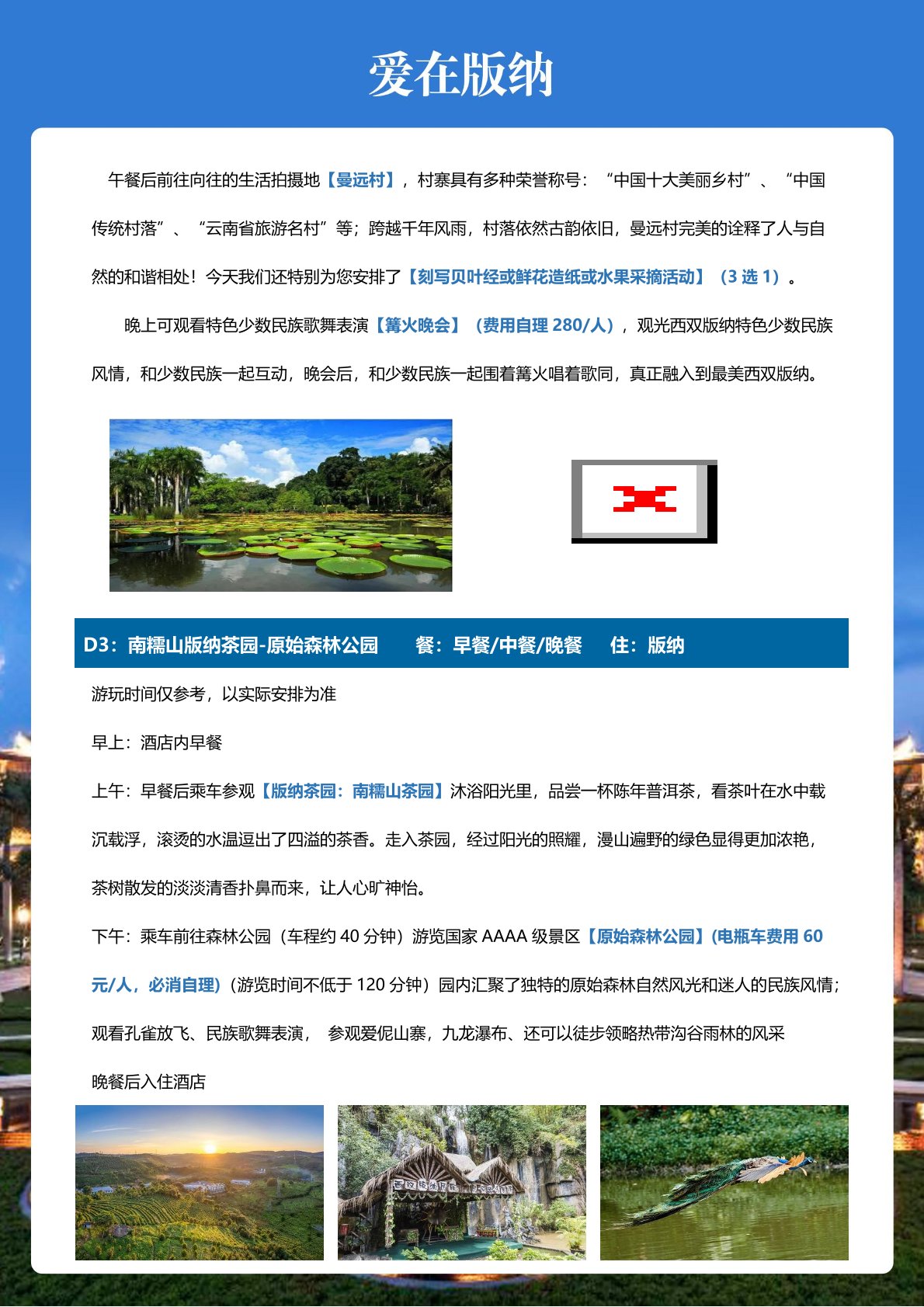表演:曼聽篝(gōu)火晚會(huì)280元/人、 夜遊船280元/人(自願選擇)