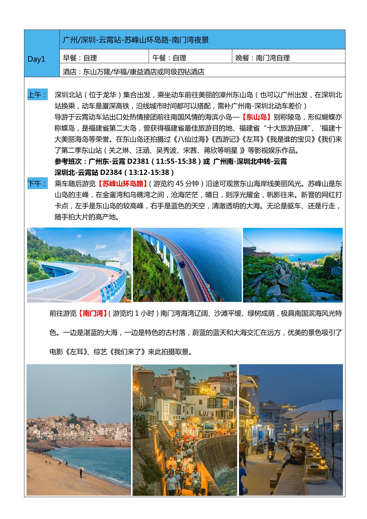 住宿標準 酒店:1 晚東山品質 4 鑽酒店+1 晚漳州五鑽酒店+1 晚泉州五鑽酒店=單房差 650 元/人