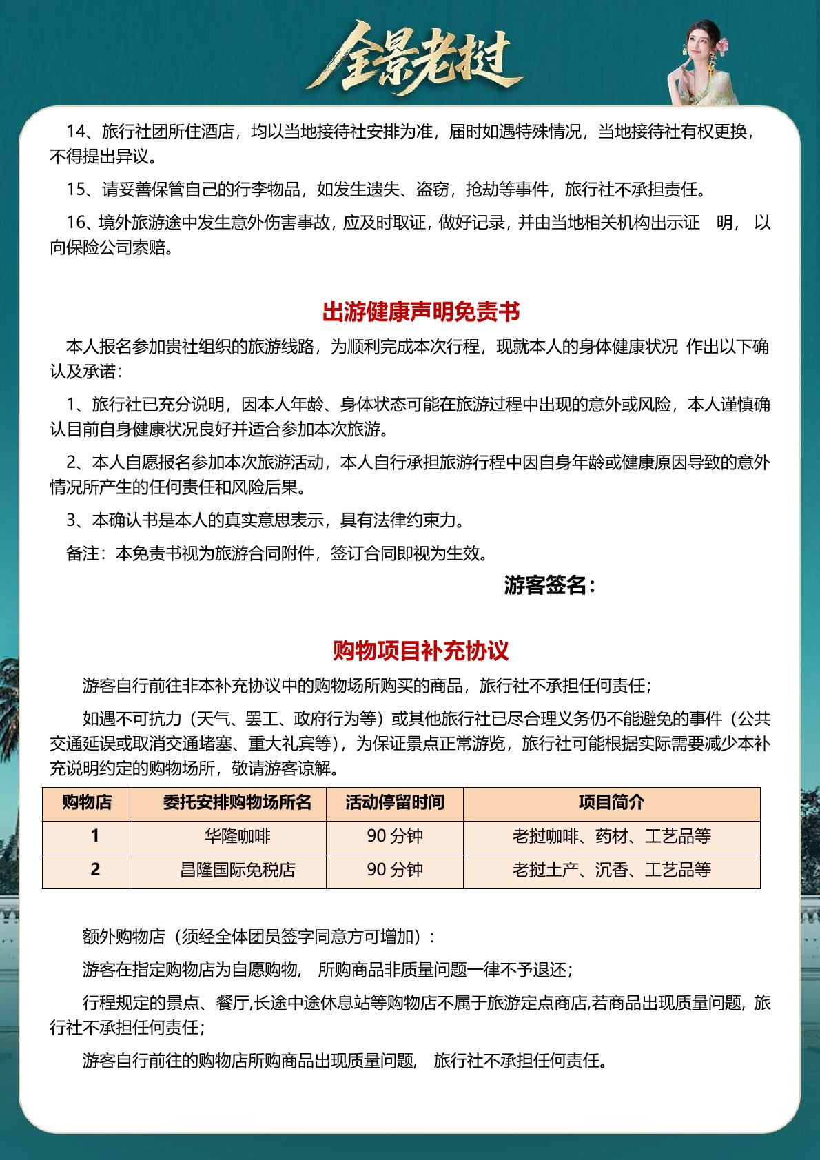 費用 遊者違約(yuē)、自身過錯、自身疾(jí)病導致的人身財產損(sǔn)失、自費選擇項目、以及旅遊費用合同