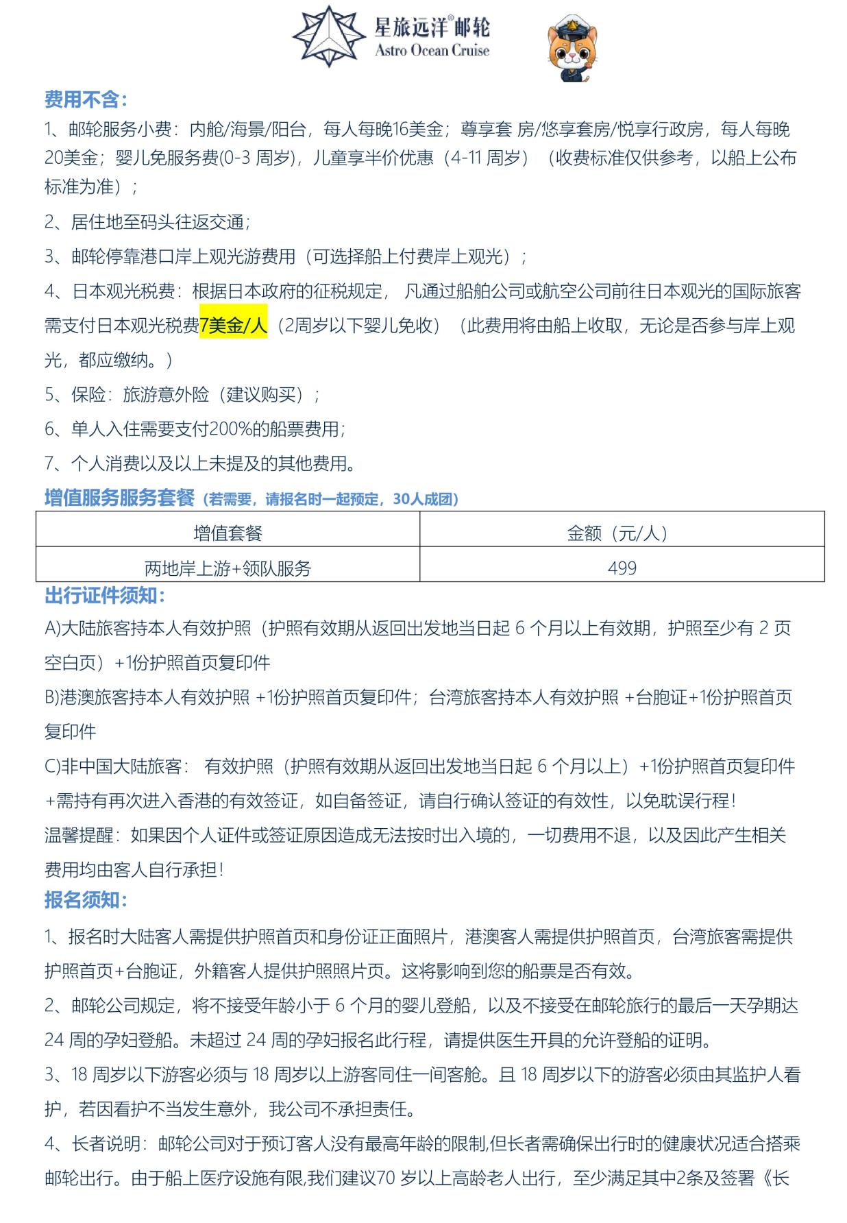 4、日本觀光稅費:根據日本政府的征稅(shuì)規定, 凡通過船(chuán)舶公司或航空公司前往日本觀光的國際旅客 需支(zhī)付日本觀光稅費7美(měi)金/人(2周歲以下嬰兒免收)(此費用將由船上收(shōu)取,無論是否參與岸上觀 光,都應繳納。)
