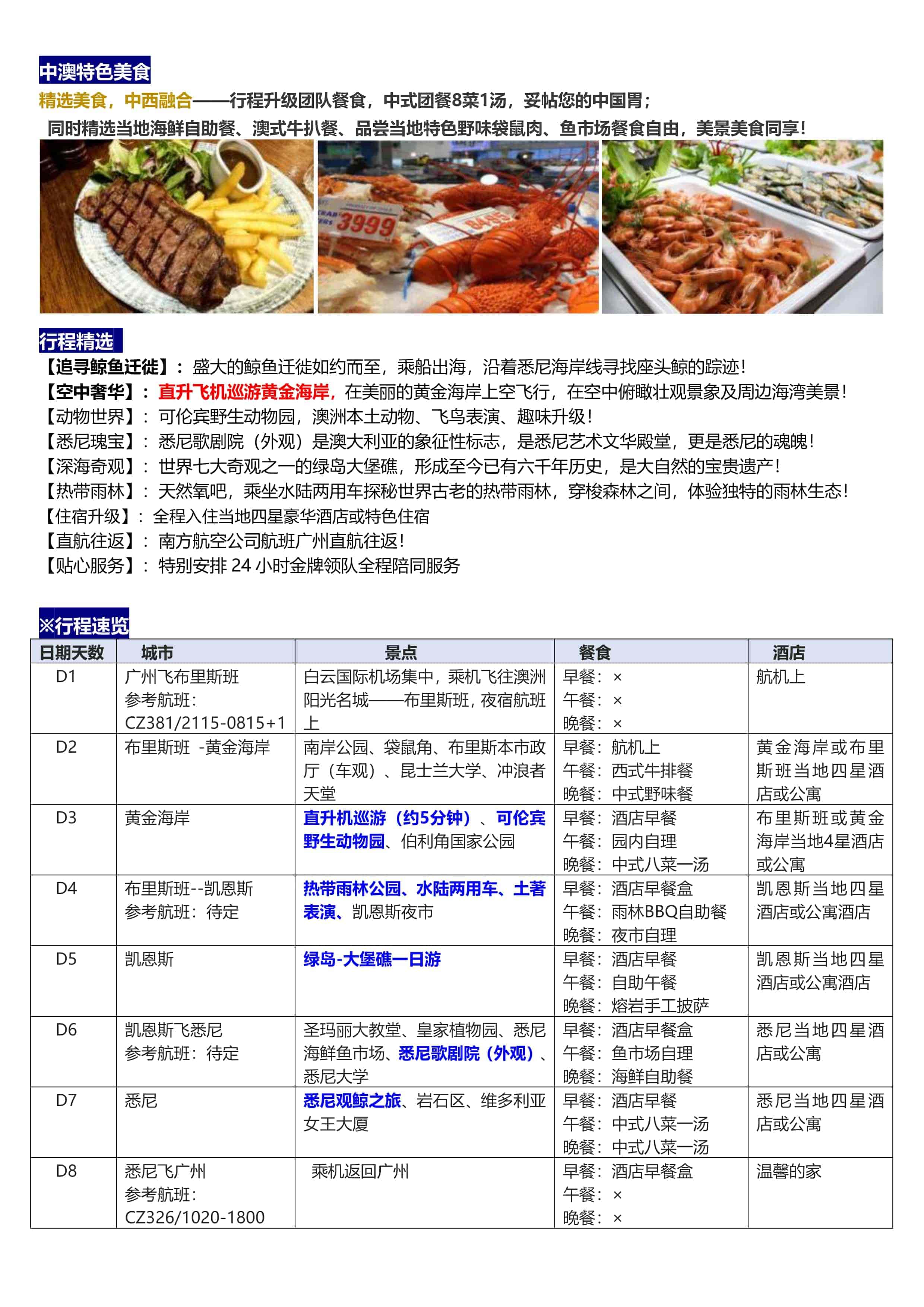 D6 | 凱恩斯(sī)飛悉尼(ní) 參考航班:待定 | 聖瑪麗大教堂(táng)、皇家植物園、悉尼海鮮魚市場、悉尼歌(gē)劇院(外觀)、 悉尼大學 | 早餐:酒店早餐盒午餐:魚市場自理 晚餐(cān):海鮮自助餐 | 悉尼當(dāng)地四星酒店或公寓 |
