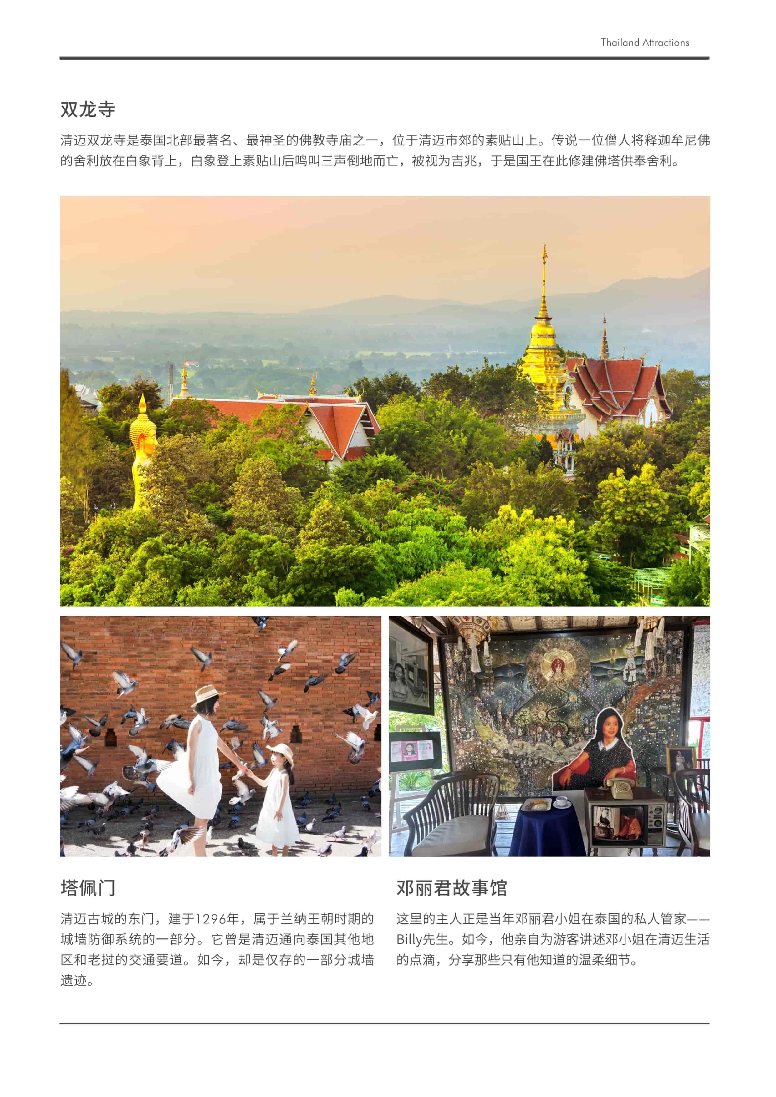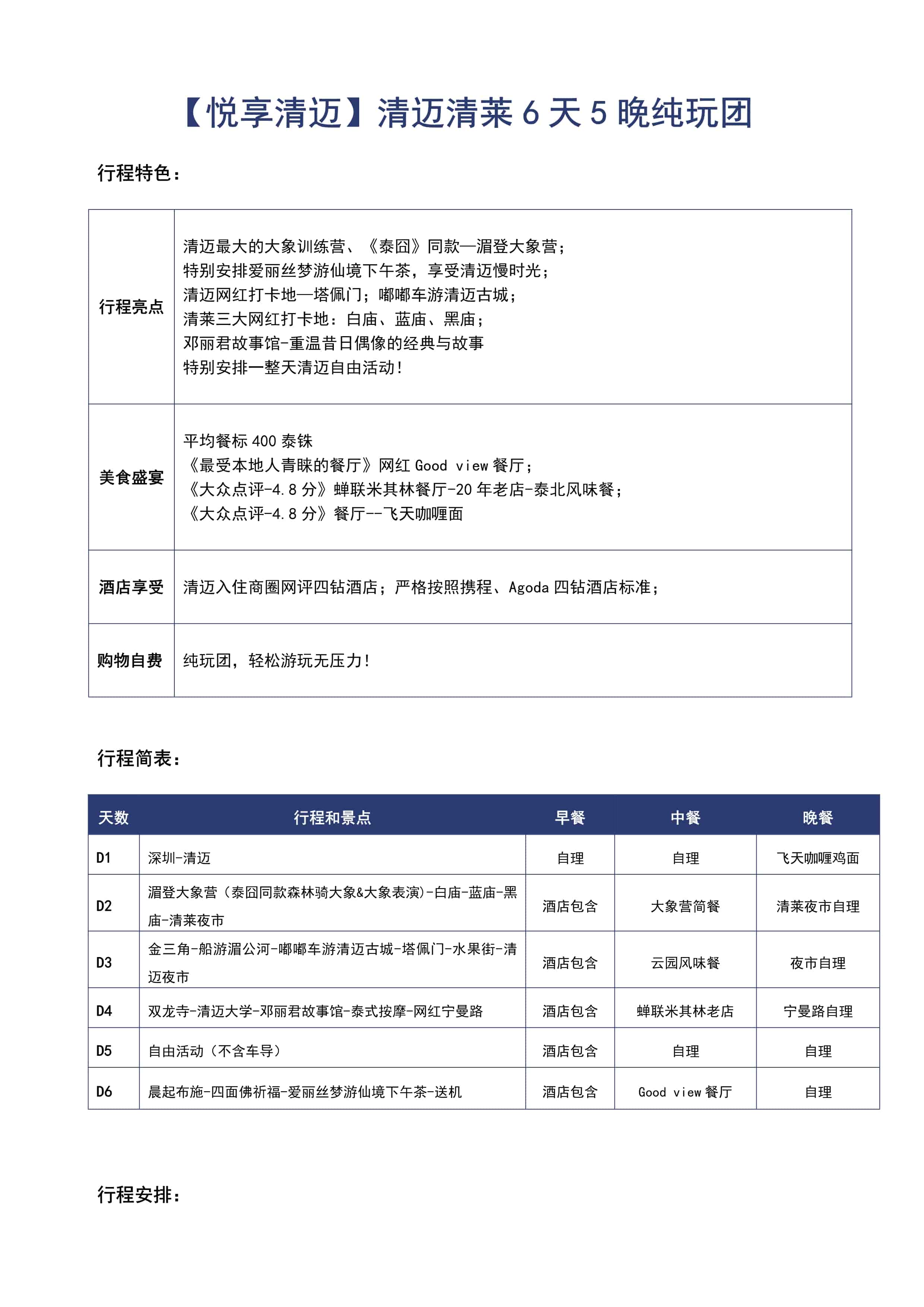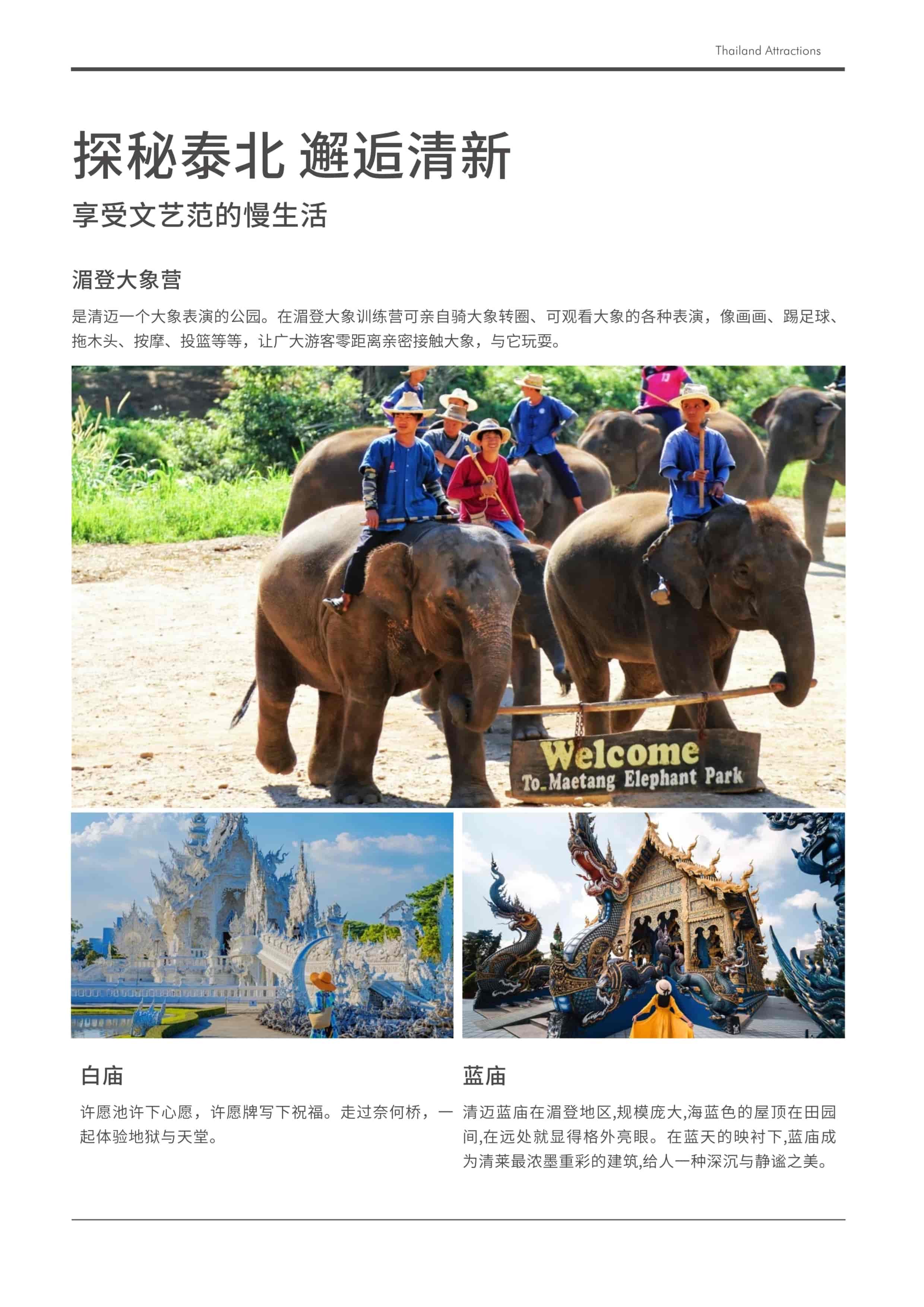 行程亮點 | 清(qīng)邁最大的大象訓練營、《泰囧(jiǒng)》同款(kuǎn)—湄登大(dà)象營; 特別安排愛麗絲夢遊仙境下午茶,享受(shòu)清邁慢時光; 清邁網紅打卡地—塔佩門;嘟嘟車遊清邁古城; 清萊三大網紅打卡地:白廟、藍廟(miào)、黑廟; 鄧麗君故事館-重溫昔日偶像的經典與故事特別安排一整天(tiān)清邁自由活動! |