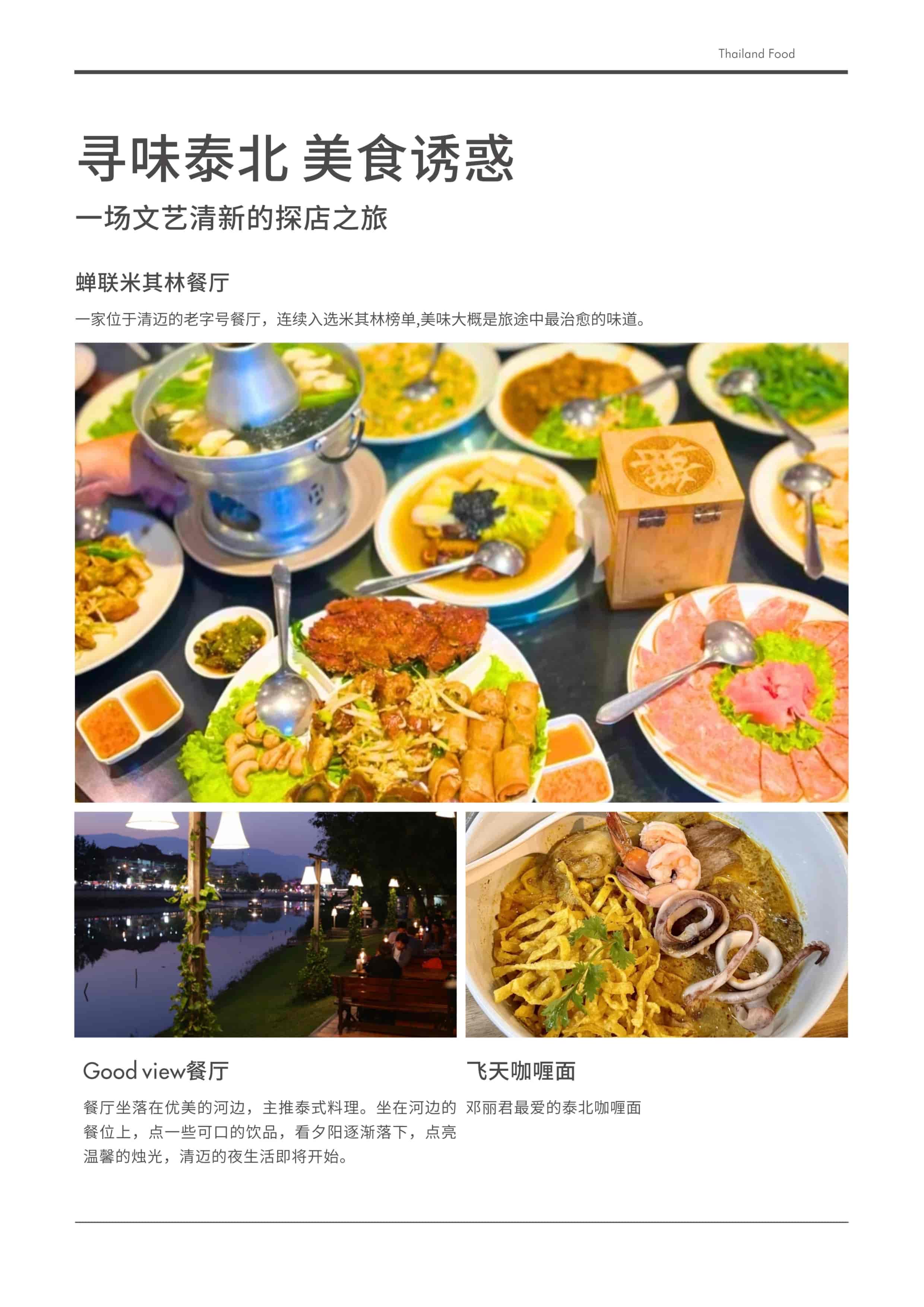 美食盛宴 | 平(píng)均餐標(biāo) 400 泰銖(zhū) 《最受本地人青睞的餐廳(tīng)》網紅 Good view 餐廳; 《大眾點評-4.8 分》蟬聯(lián)米其林餐(cān)廳-20 年老店-泰北風味餐; 《大(dà)眾點評-4.8 分》餐廳--飛(fēi)天咖喱麵 |