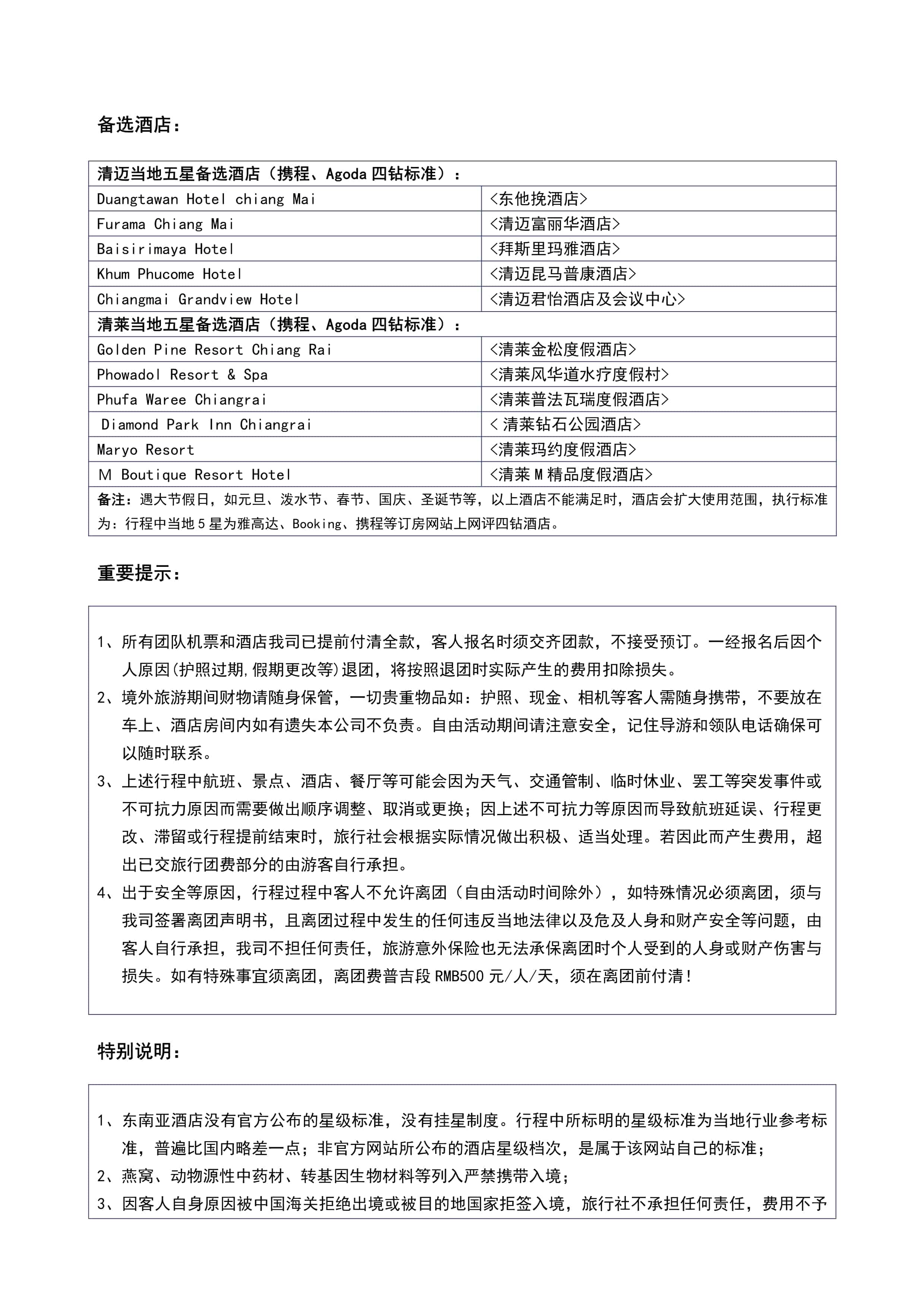備注:遇大節假日,如元旦、潑水節、春節、國(guó)慶、聖誕節等(děng),以上酒店不能滿足時,酒店(diàn)會擴大使用範圍(wéi),執行標準 為:行程中當地 5 星為雅高(gāo)達、Booking、攜程等訂房網站(zhàn)上網評四鑽酒店。 | |