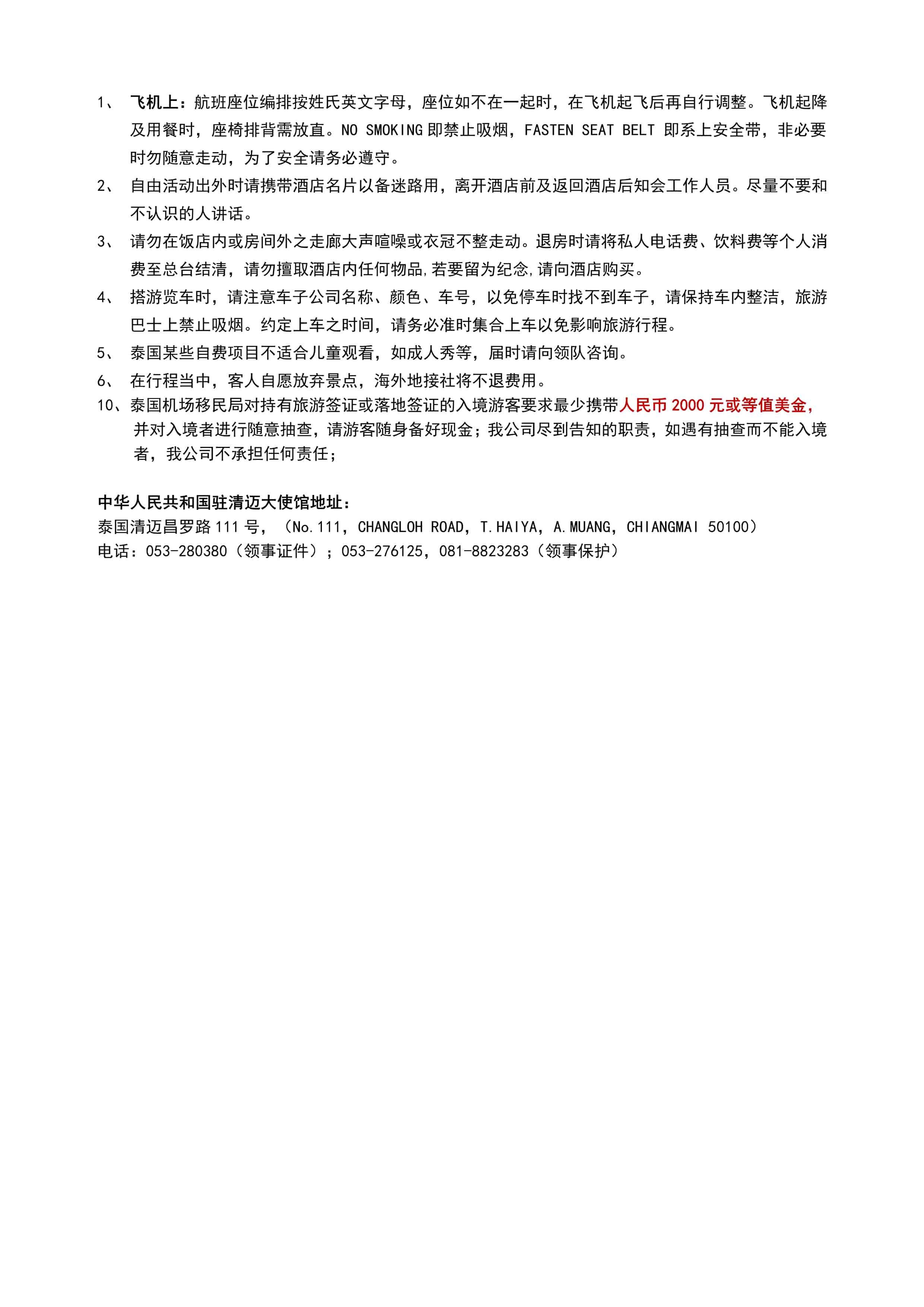 10、泰國機場移民局對持有旅遊簽證(zhèng)或落地簽證的入境遊(yóu)客要求最少攜帶人民幣 2000 元或等(děng)值美金,並對入境者進行隨意抽查,請遊客隨身備(bèi)好現金(jīn);我公司盡到(dào)告知(zhī)的職責,如遇有抽查而不能入境者,我公司(sī)不承擔任何責任;