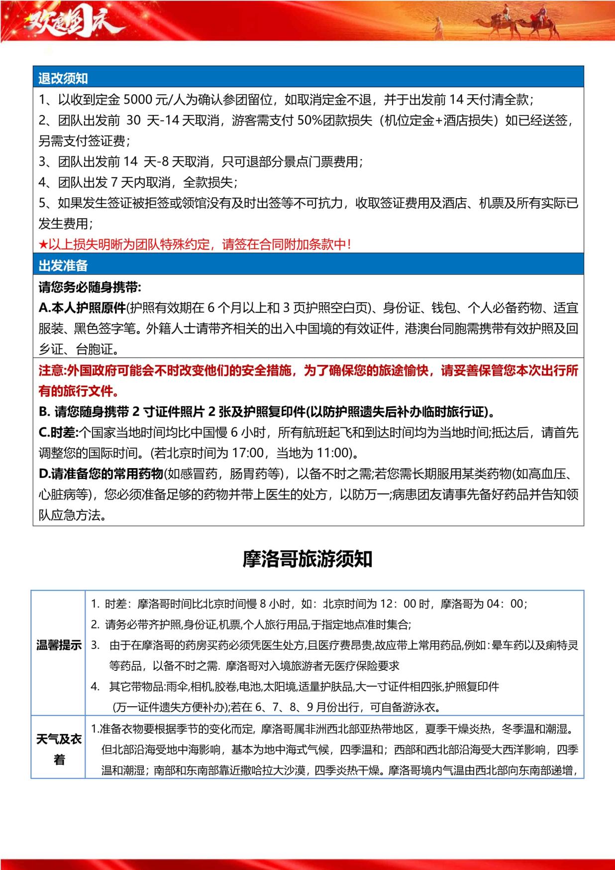 溫馨(xīn)提示 | 時差:摩洛哥時間(jiān)比北(běi)京時間慢 8 小時,如:北京時間為(wéi) 12:00 時,摩洛哥為 04:00; 請務必帶齊護照,身份(fèn)證,機票,個人旅行用品,於指定地點準(zhǔn)時集合; 由於在摩洛(luò)哥的藥房買藥必須憑醫(yī)生處方,且醫療費昂貴,故應帶上常用藥品,例如(rú):暈(yūn)車藥以及痢特靈 等藥品,以備不時之(zhī)需. 摩洛哥對入境旅遊者無醫療保險要求 其它帶物品:雨傘,相機(jī),膠卷,電池,太陽境,適量護膚品,大一寸證件相(xiàng)四張,護照複印件