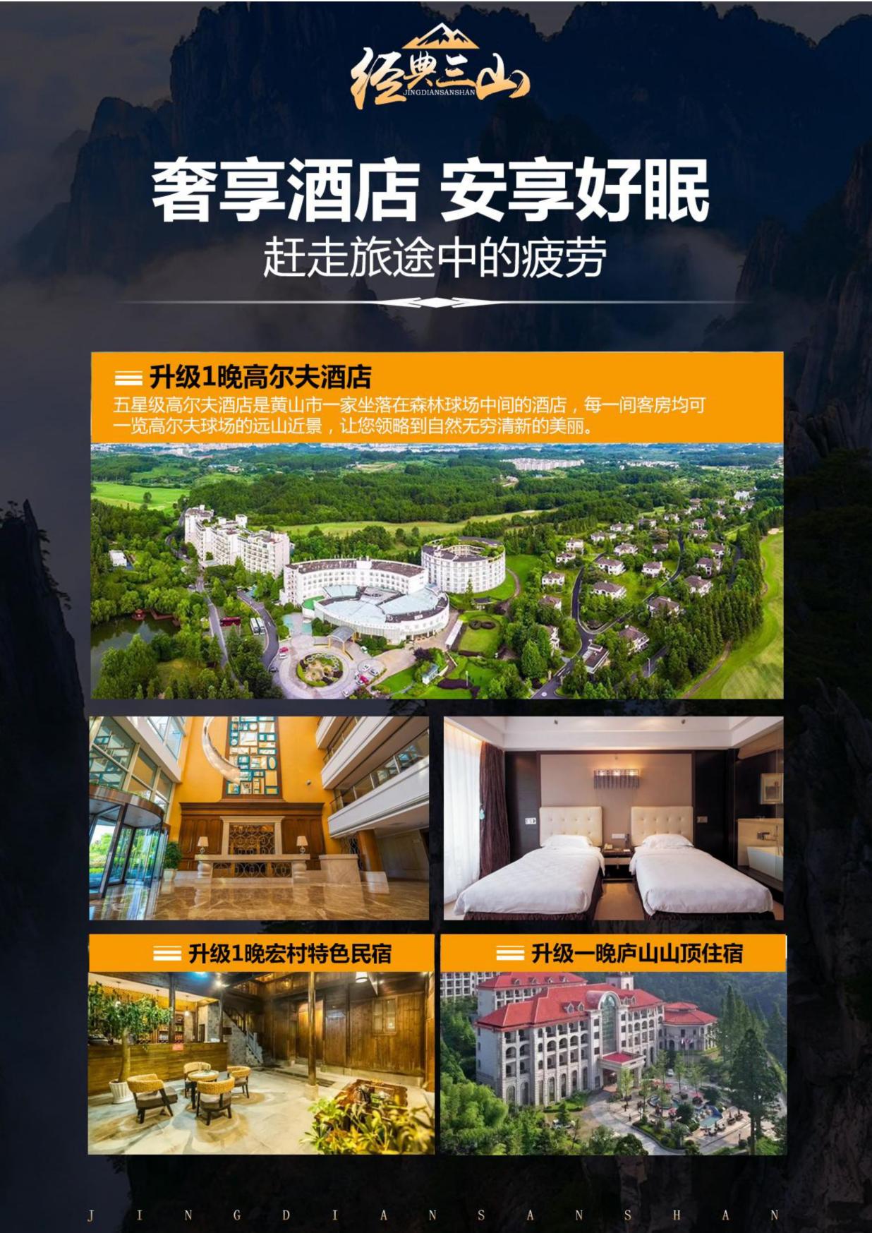 奢享酒店:特色 1 晚(wǎn)高爾夫酒店;1 晚宏村(cūn)特(tè)色民宿;1 晚廬山山頂住宿(xiǔ)(深度遊覽廬山美景) 升級 1 晚望仙穀外特色(sè)民宿,可深度遊覽望仙穀夜(yè)景 奢享(xiǎng)美食:5 早餐 4 正(zhèng)餐,其中安(ān)排一頓徽州(zhōu)臭(chòu)鱖魚特色餐(cān)+徽州黃梅(méi)戲表演