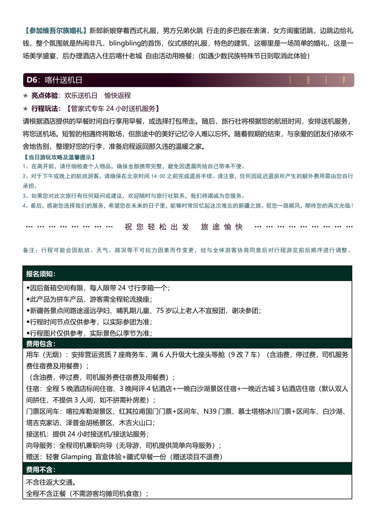 2.七大場景(jǐng)設計,旅行情緒價值拉滿; a:參加一場當地人的維吾(wú)爾族婚(hūn)禮,能歌善舞 儀式感(gǎn)具象化 b:現場觀看製作饢,吃一口熱饢,像當地人一樣,沒有一個熱饢能完整回家; c:輕奢 Glamping 盲盒,即刻與美景碰杯暢(chàng)飲,當地維吾爾族糕(gāo)點感受當地美(měi)食文化; d:征服 4688 慕士塔格冰川,儀式感勳(xūn)章及時獎勵,做自己人生的 MVP 為您(nín)定製專屬高光時(shí)刻; e:探訪(fǎng)郵局郵寄明信片,旅行(háng)的(de)獲得感郵寄給遠方的(de)他們或(huò)未(wèi)來的自己; f:紅(hóng)其拉甫國門 瓦罕走廊 貼心(xīn)準備小道具(jù),讓愛國更(gèng)具象化; g:巴鐵集市,感受一(yī)場來自中國最西段的跨國貿易 Live;