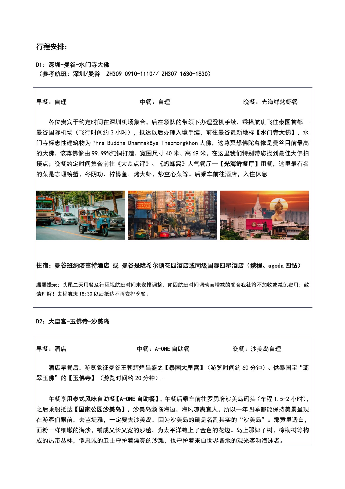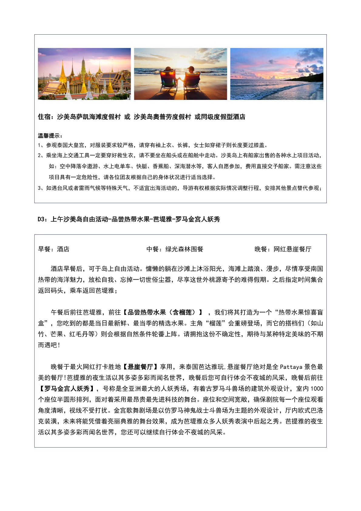 行程亮點 泰國知名連鎖品牌(pái)—Health Land 健康島泰式按摩,非常規按摩(mó)可比擬; 最美沙灘—沙美島; 芭堤雅最受(shòu)歡迎的人妖(yāo)秀之一—羅馬金宮人(rén)妖秀; 曼穀新地標、泰國最大商場—暹(xiān)羅天地 ICONSIAM、水門寺;