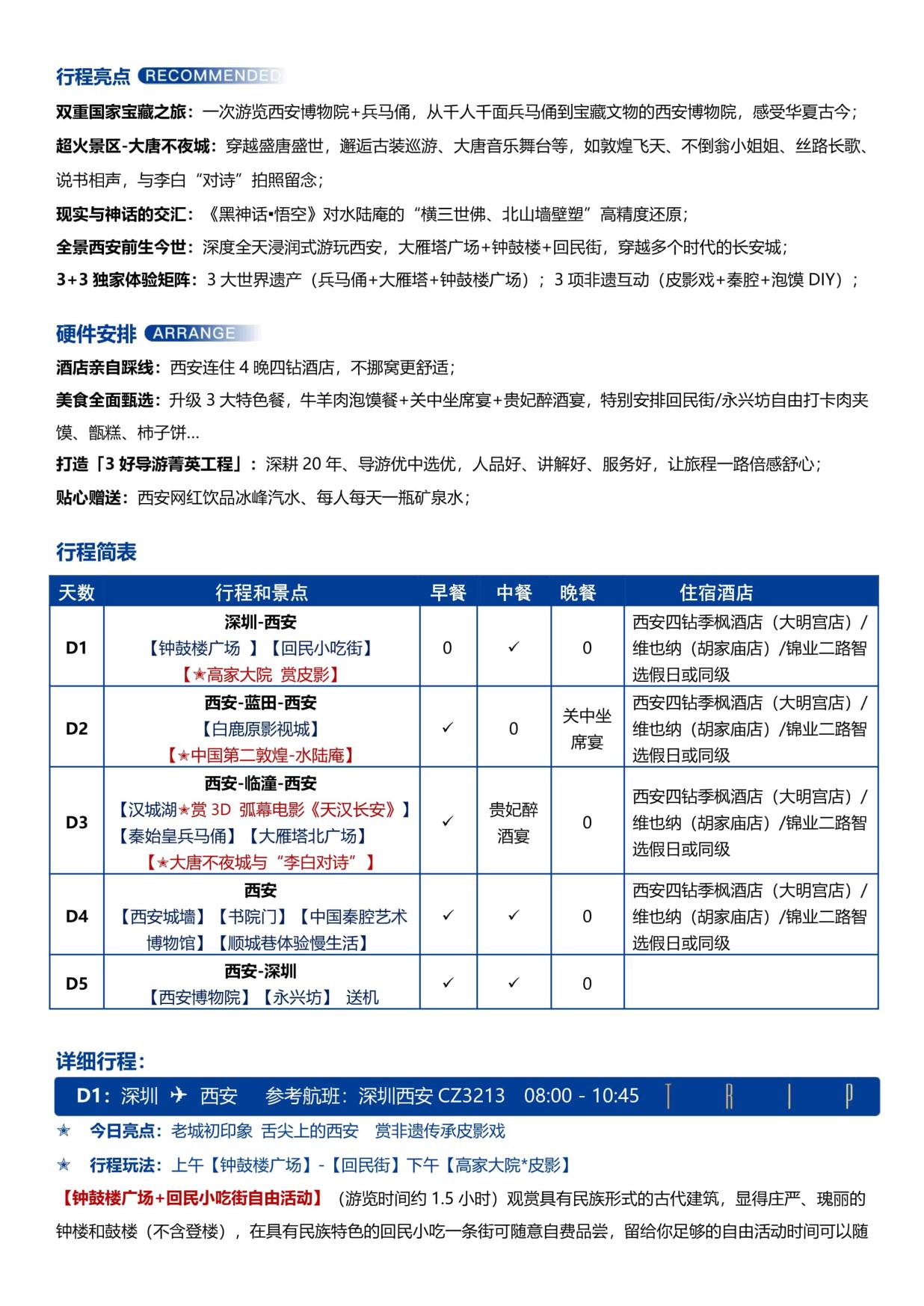 D1:深圳 ✈ 西(xī)安 參考航班:深圳(zhèn)西安 CZ3213 08:00 - 10:45