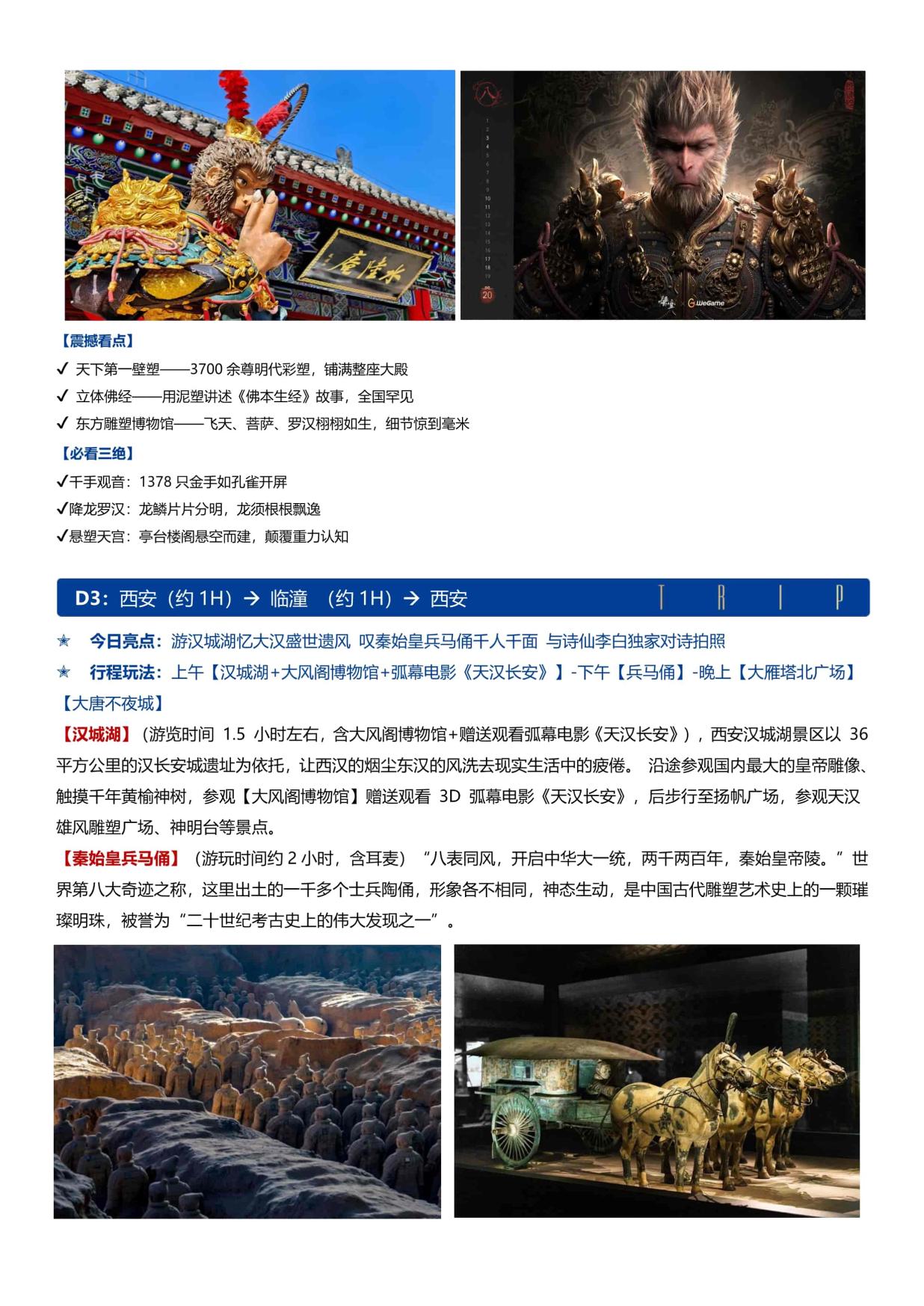 3+3 獨(dú)家體驗矩陣:3 大(dà)世界遺(yí)產(兵馬俑+大雁塔+鍾鼓樓廣(guǎng)場);3 項非遺互動(dòng)(皮影戲+秦腔+泡饃 DIY);