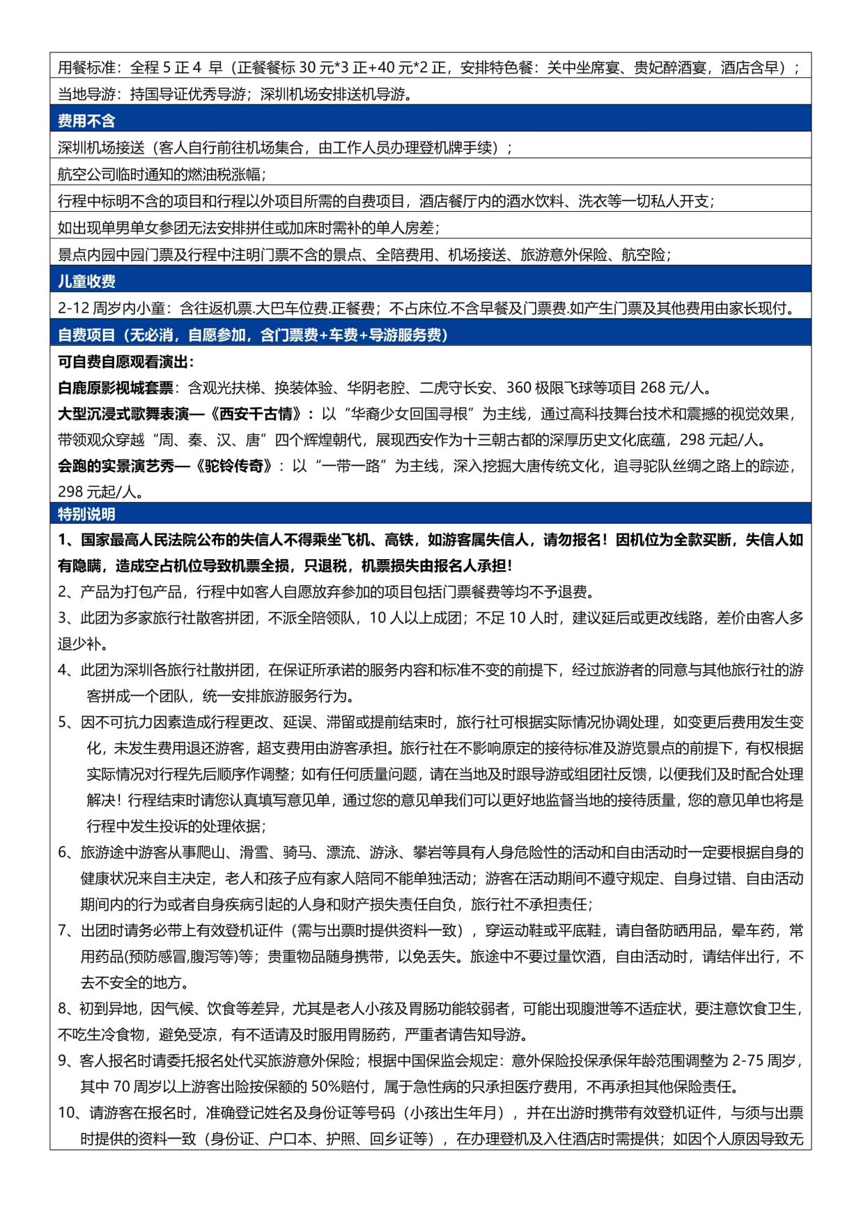 用餐標準:全程 5 正(zhèng) 4 早(正餐餐標 30 元*3 正+40 元(yuán)*2 正,安排特色餐:關中坐(zuò)席宴、貴妃醉酒(jiǔ)宴,酒店含早); |