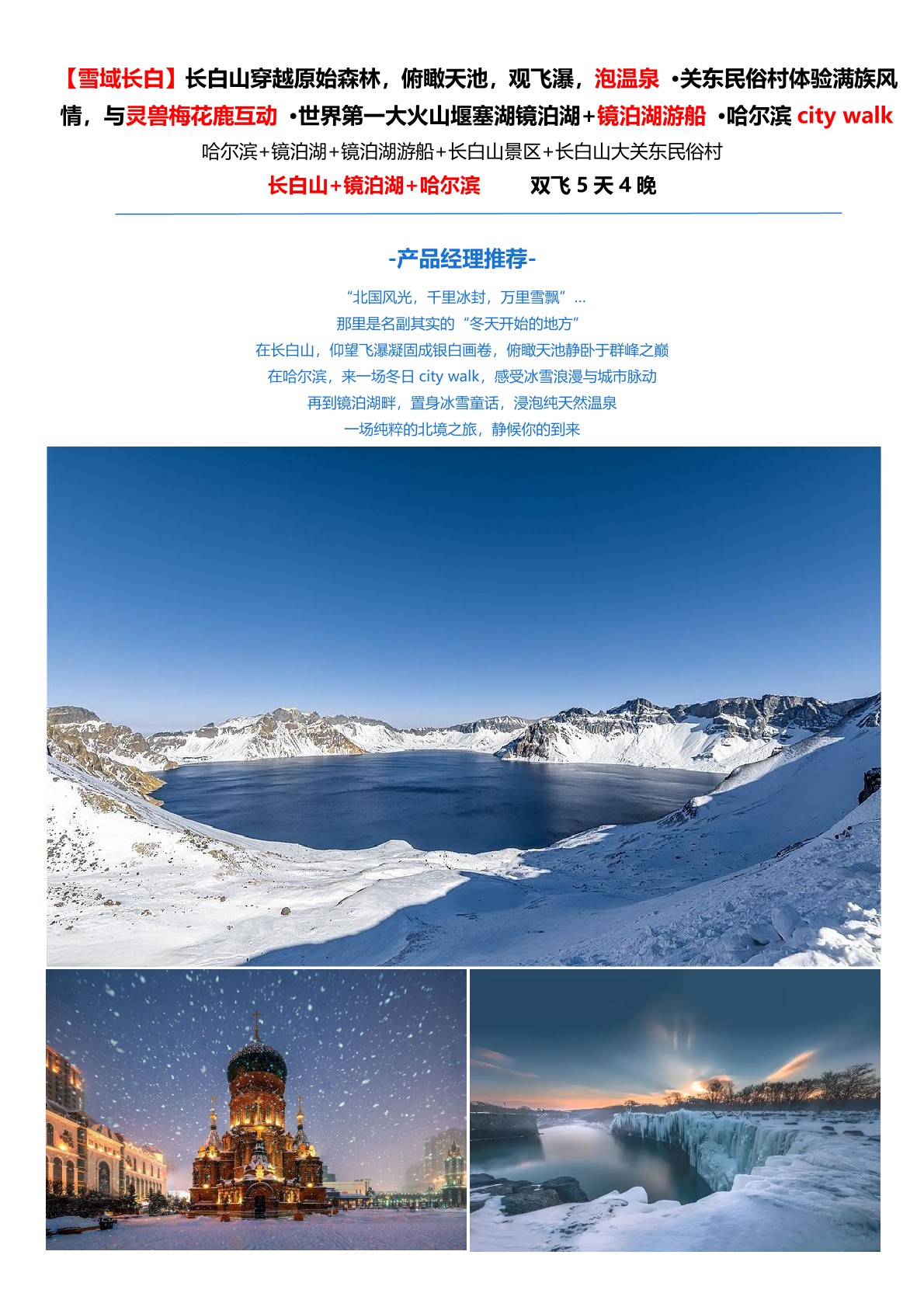 “北(běi)國風光,千裏冰封,萬裏雪飄”… 那裏是名副其實的“冬天開始的地(dì)方” 在(zài)長白山,仰望飛瀑凝(níng)固成銀(yín)白畫卷,俯瞰天池靜臥於群峰之(zhī)巔 在(zài)哈爾濱,來一場冬日 city walk,感受冰雪浪漫與城市脈動 再到鏡泊湖畔,置身冰雪(xuě)童話,浸泡純天(tiān)然溫泉 一場純粹的北境之旅,靜候你的到來