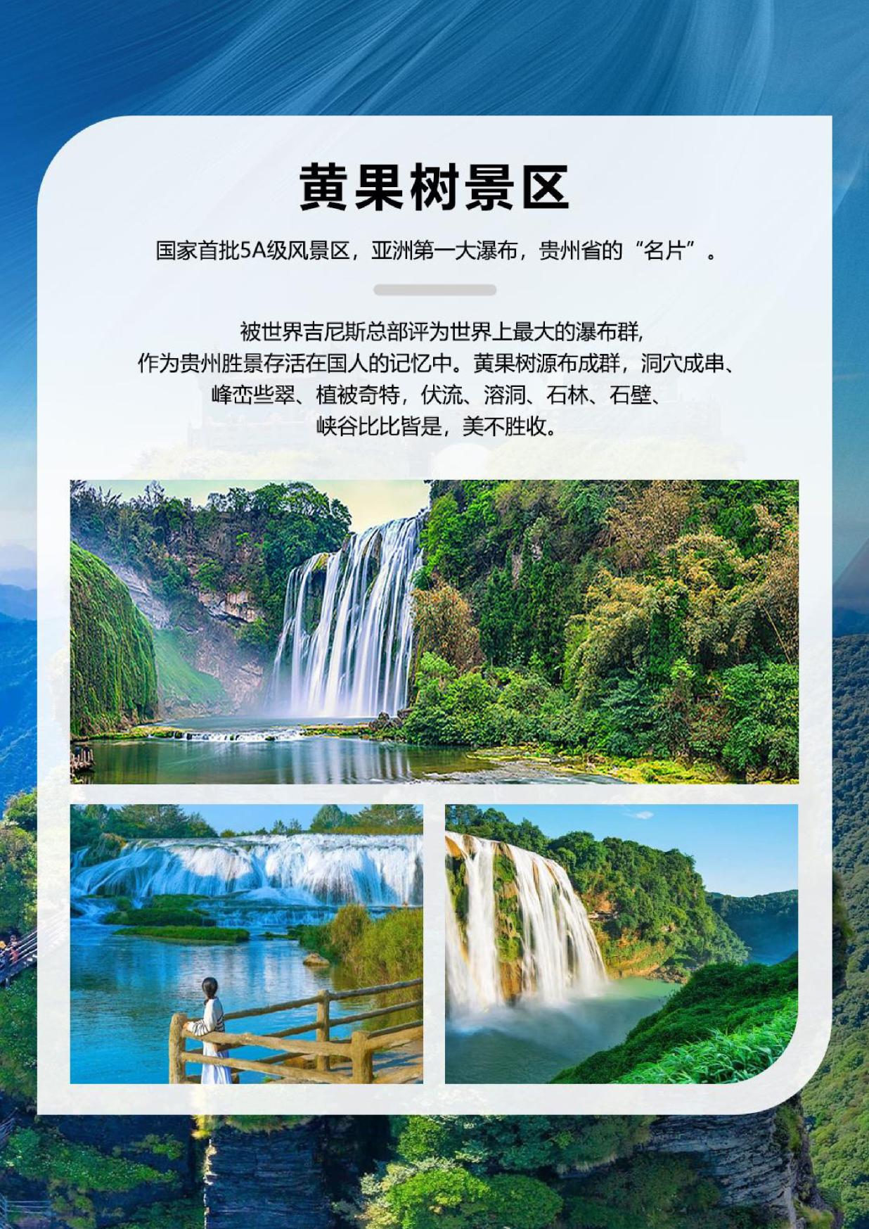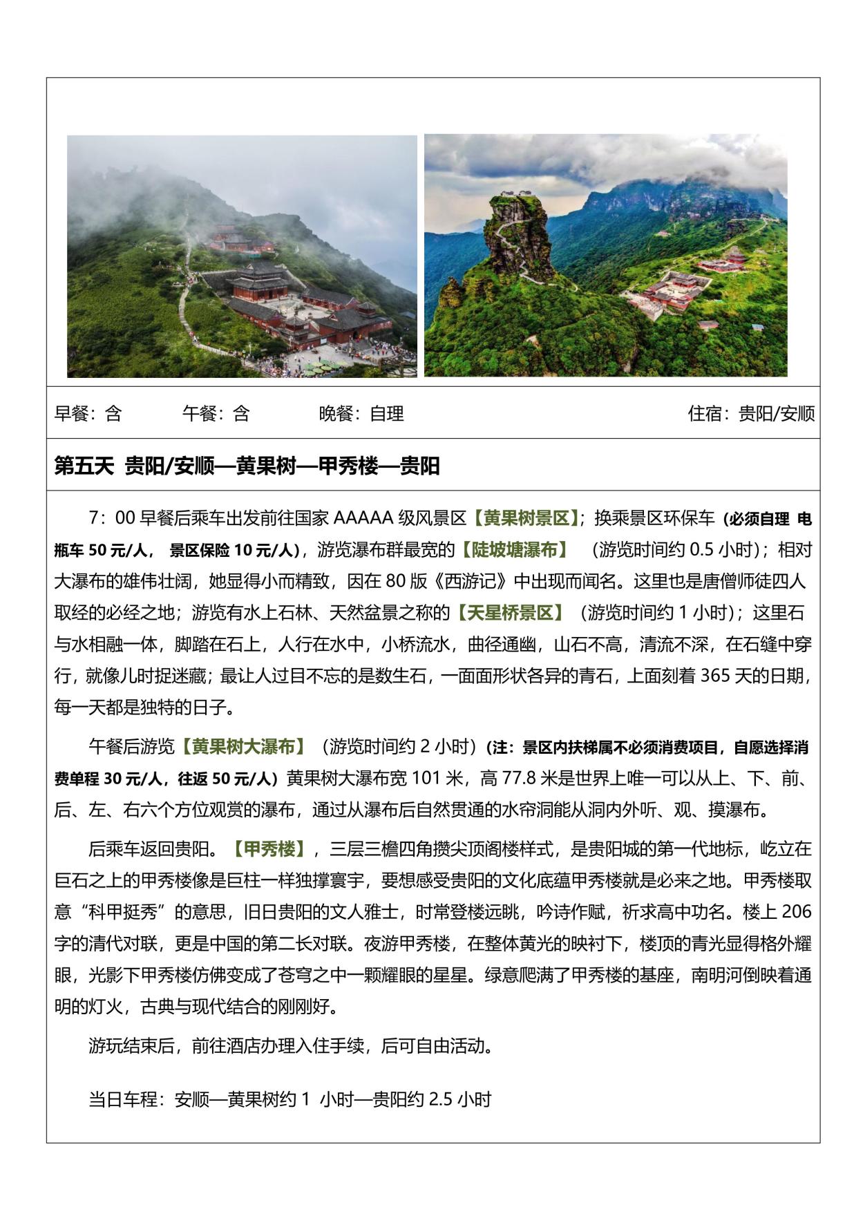 不含項目 | 必須自理費(fèi)用:358元/人 小七孔電(diàn)瓶車40元/人+保險10元/人,黃果樹景區環保車50元(yuán)/人+保險10元/ ,西江電瓶車(chē)20元/人+保險10元/人,梵淨山景區(qū)電瓶車48元/人、保(bǎo)險10元/人(rén)、往返索道140/人(rén),鎮遠古城電瓶車20/人,其它均屬不必須產生費用。 景區內另行(háng)付費景點或娛樂項目,請根據情況酌情(qíng)自願選擇。 |