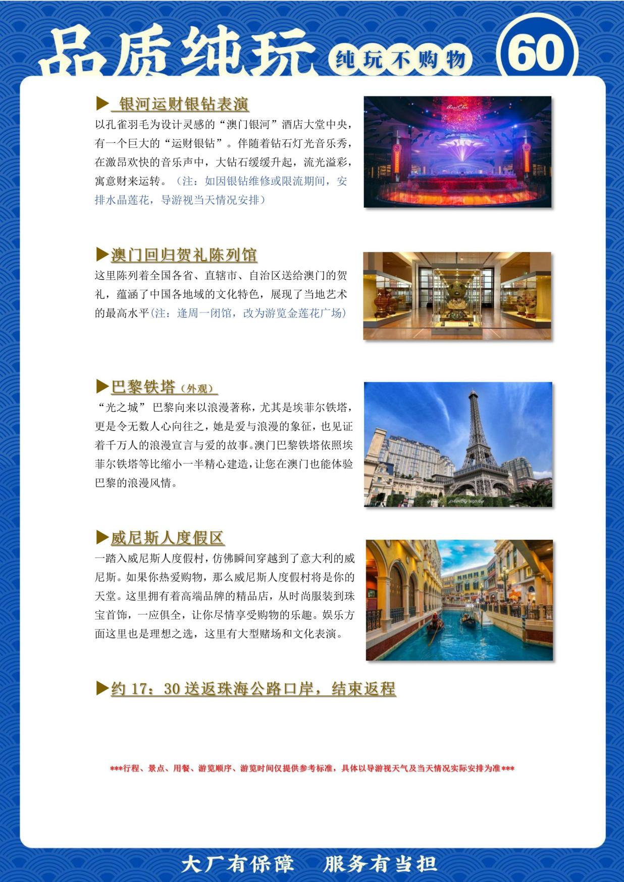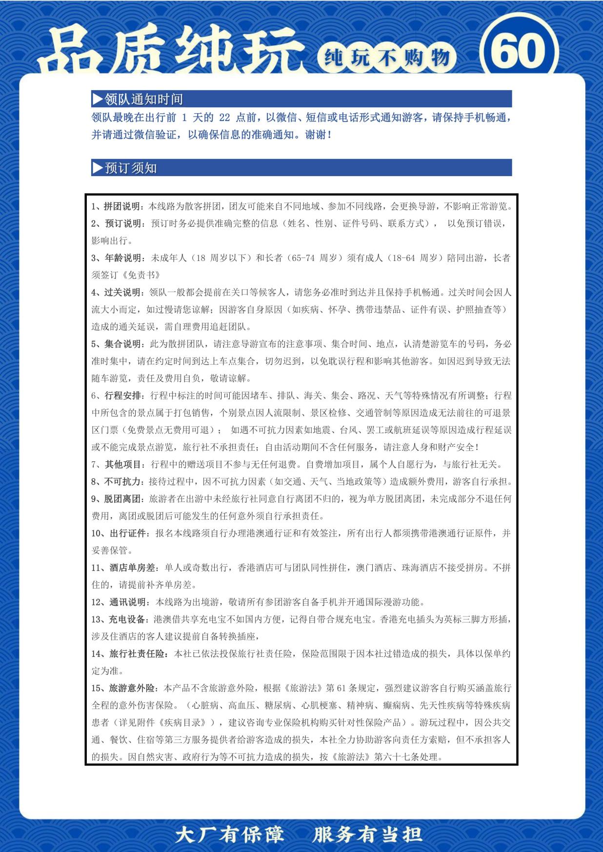 費(fèi)用 不含 | 1.行程外產生的私人費用 2.旅遊證(zhèng)件簽(qiān)注費 3.不含單人房差 4.不含珠海返回出發地交通 |