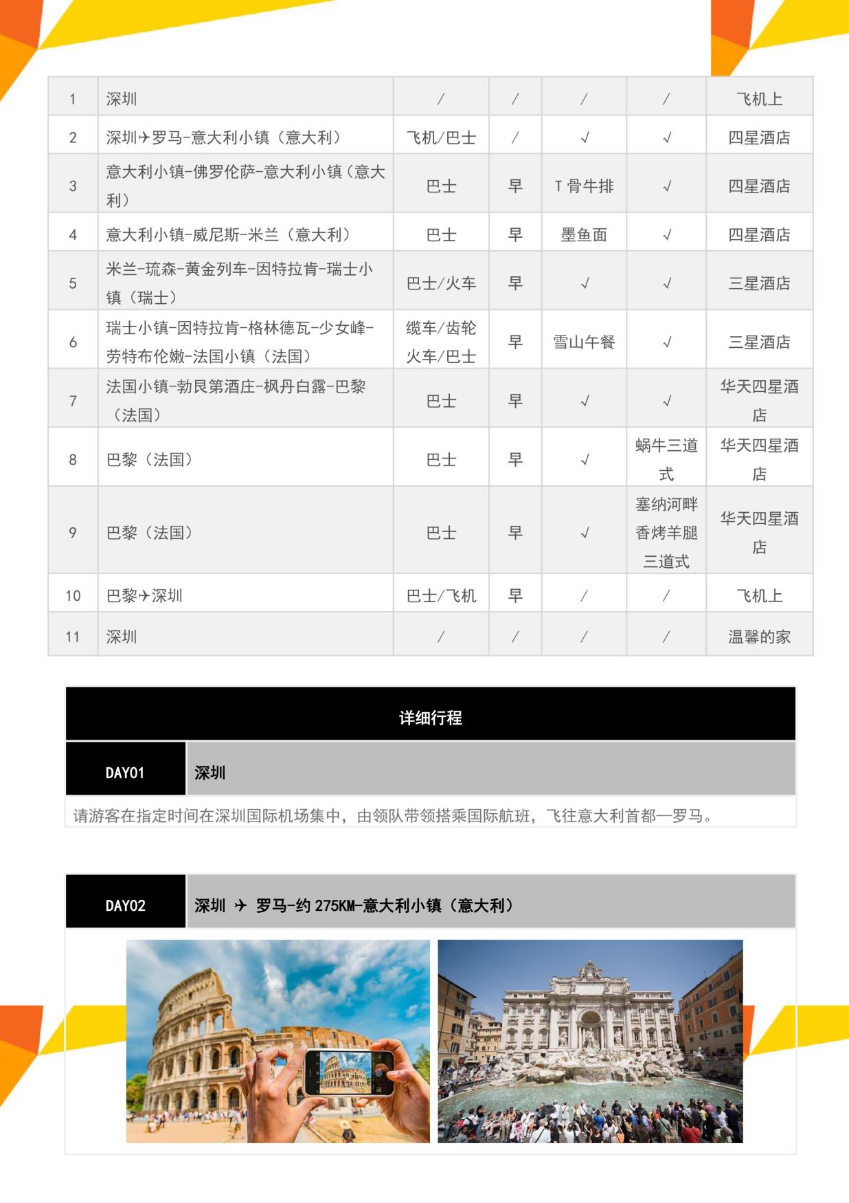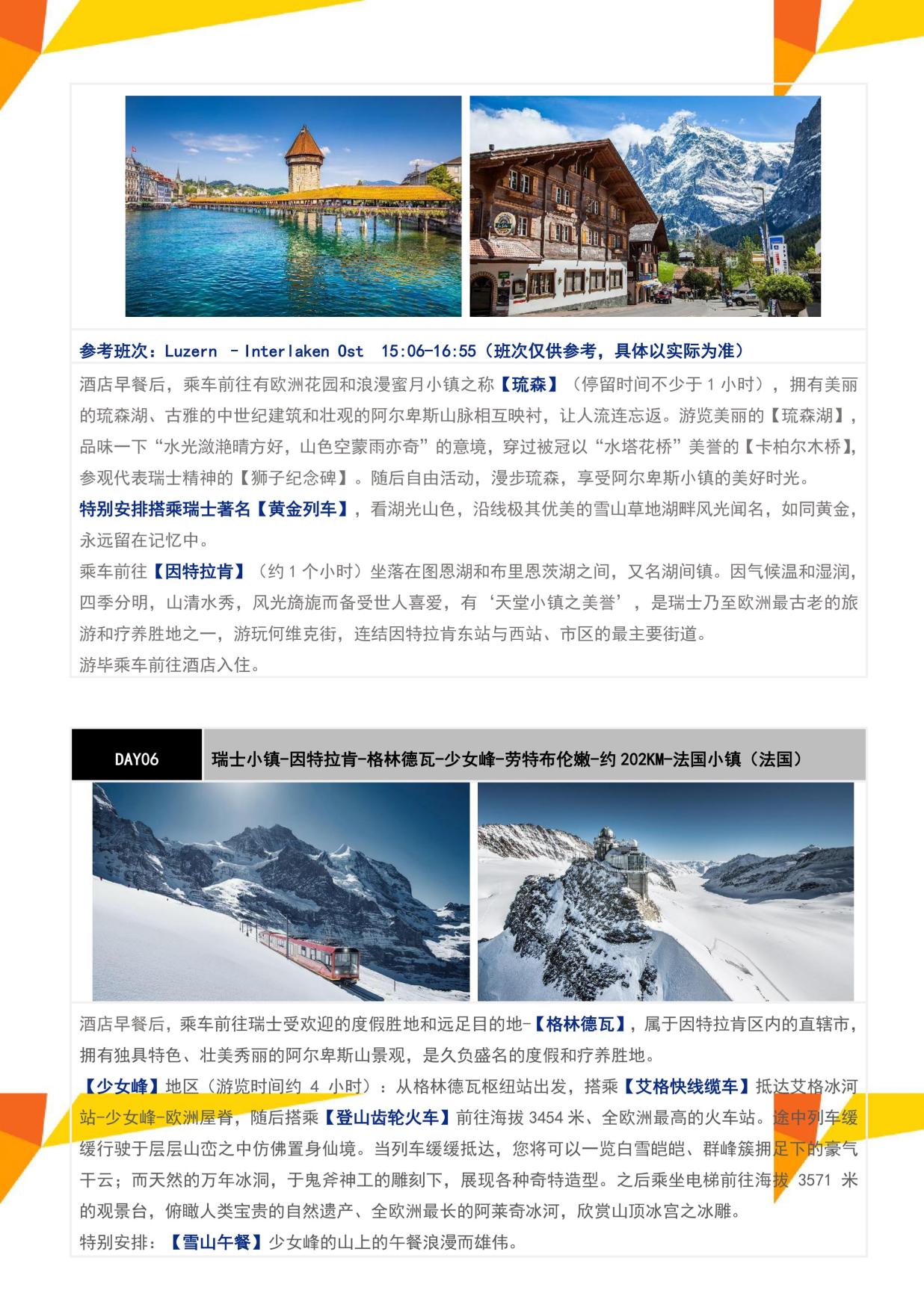 3. 行程所列餐食,酒店早(zǎo)餐,全程16個正餐,11個中式團餐六菜一湯(tāng),5個特色餐:少女(nǚ)峰雪山餐廳午餐+意大利T骨牛排+法國塞納河(hé)畔香烤羊腿三(sān)道式+法式蝸牛三道式+意大利墨魚麵、贈送意大利特色冰淇淋(單球(qiú))(如遇退餐12歐元/人/餐,瑞士段22歐元/人/餐);如遇趕飛機/火車/遊輪等無(wú)法安排酒(jiǔ)店早餐,則改為打包早(zǎo)餐,如遇指定的餐廳關(guān)閉或無法安排中餐的(de)城市或用餐時間在高(gāo)速公路(lù)休息(xī)站無法安排用餐,將安排當地餐或退餐費,如在全團協議下同意更改為特色餐,不退正常團餐費用,所有(yǒu)餐(cān)食如自動(dòng)放(fàng)棄(qì),款項恕不退還;