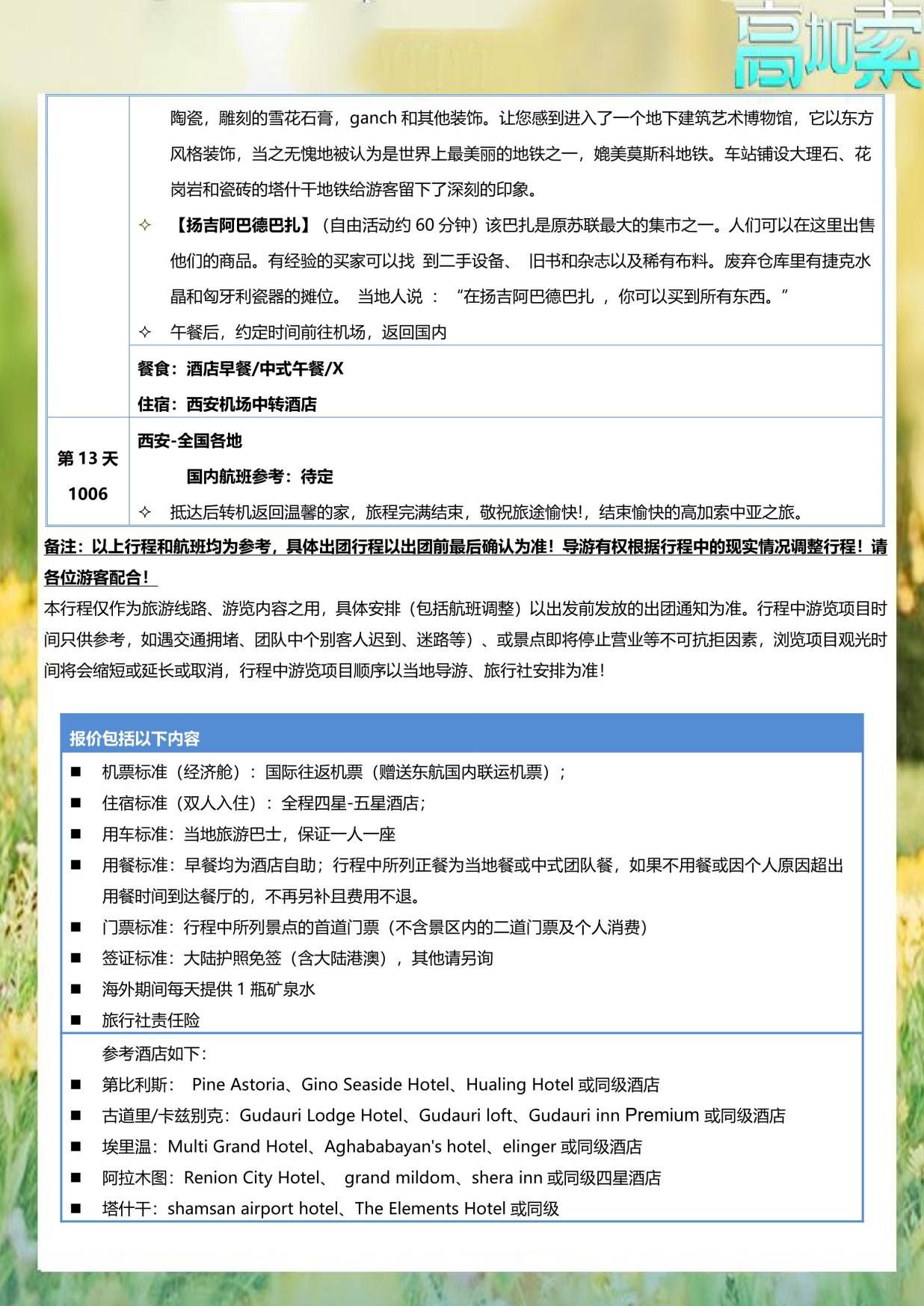 n 用餐標準:早餐均為酒店自助;行程中所列正餐為當地(dì)餐或(huò)中式團隊餐(cān),如果不用餐或因個人原因超出用餐時間到達(dá)餐廳的,不再另補且費用不退。