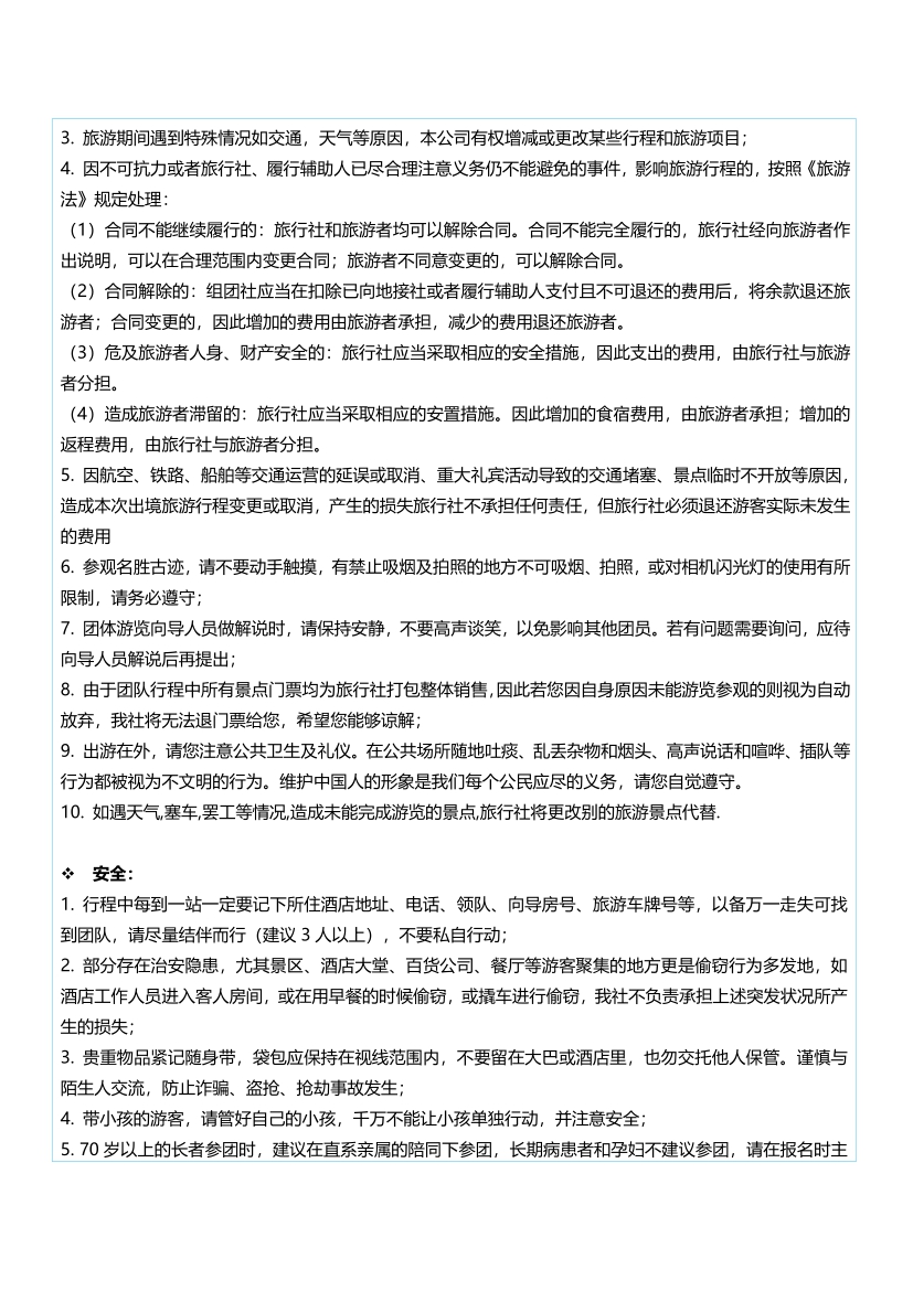 8、非我社所(suǒ)能(néng)控製因素下引起的(de)額外費用,如:自然災(zāi)害、罷工、境外當地政(zhèng)策(cè)或民俗禁忌、景(jǐng)點維修等;